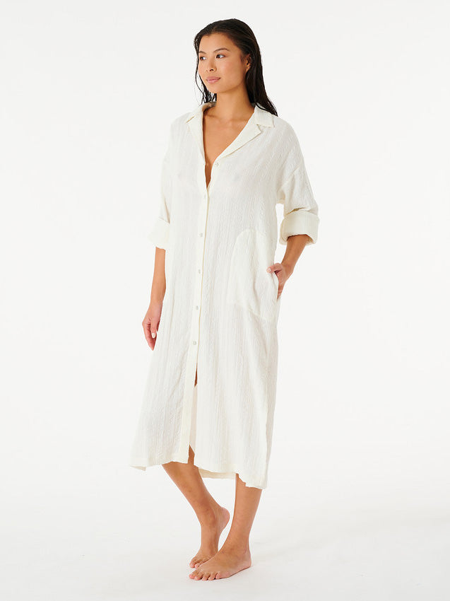 Fuldend dit sommerlook med denne bohemian og afslappede skjortekole fra Rip Curl! Du kommer til at leve i denne skjortekjole, der er designet med et feminint og ribbet mønster (se billeder).