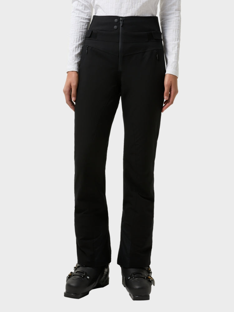 Borja er tekniske ski-bukser designet til kvinder, der kræver både bevægelsesfrihed og høj funktionalitet i sneen. Bukserne er fremstillet i et to-lags 4-vejs stretchmateriale med en vind- og vandafvisende finish samt fuldt tapede sømme for maksimal beskyttelse. De tilbyder et vandsøjletryk på 10 000 mm og en åndbarhed på 15 000 g/m²/24h, hvilket gør dem klar til krævende forhold på pisterne. Taljen har elastik og højt lændesegment med justerbar linning og velcro-lukning, mens benafslutningerne har lynlås og indvendig snefang med forstærkede kanter – alt sammen kombineret i et slankt, sporty snit med diskrete Fire + Ice-detaljer.
