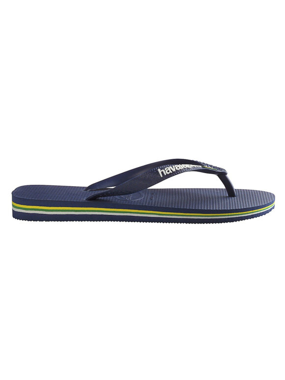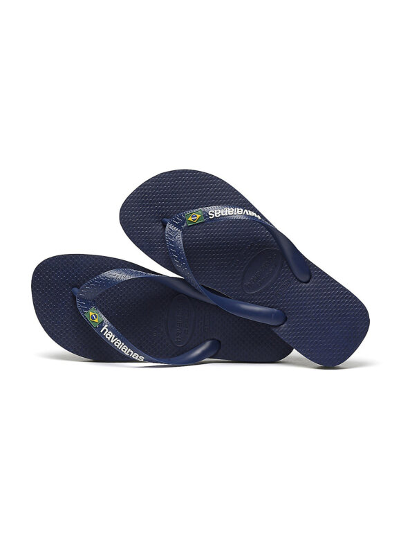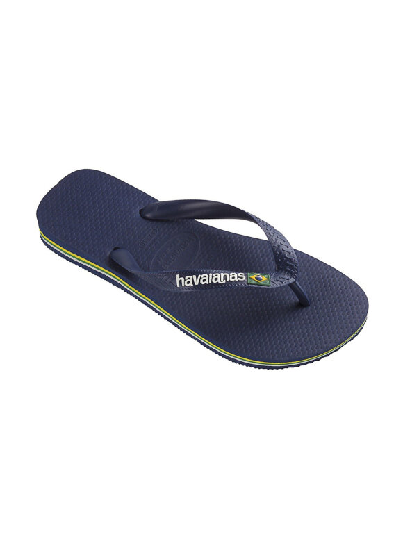 Populære klipklappere fra Havaianas til børn i klassisk mørkeblå med Brasil flag på stroppere. Klipklappen kan bruges på stranden, men også som foretrukne sommersandaler.